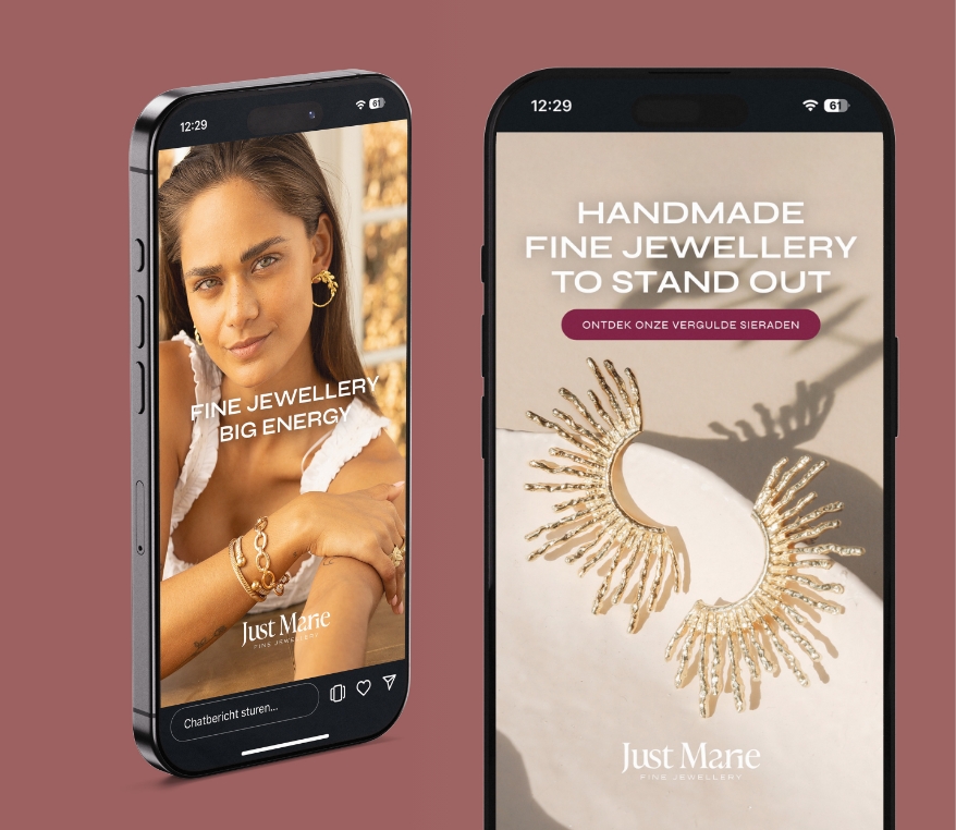 We ontwikkelden voor beide lijnen een heldere en samenhangende merkidentiteit, elk met een eigen uitstraling maar wel duidelijk zussen van elkaar. Voor Just Marie creëerden we een luxe, moderne huisstijl die aansluit bij het handgemaakte en unieke karakter van de sieraden. Studio Marie kreeg een stijl die daar precies op aansluit. Daarnaast schreven we de brandstory en websiteteksten, ontwikkelden een social branding die aansluit bij de lifestyle van de doelgroep en ontwierpen we advertentiemateriaal dat de merkbeleving direct herkenbaar maakt. Het resultaat? Een sterk duo dat zowel online als offline straalt.