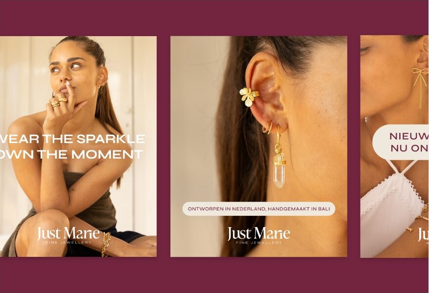 Voor sieradenlabel Just Marie ontwikkelden we een rebranding die de kern van het merk opnieuw tot leven brengt: stijlvol, zelfverzekerd en moeiteloos chic. Wat begon als een liefde voor bijzondere oorbellen groeide uit tot een sieradenmerk met een eigen signatuur – handgemaakt door een meester-goudsmid op Bali, ontworpen door founder Marina met oog voor detail en persoonlijkheid. Daarnaast bouwden we met Studio Marie een zustermerk dat de collectie aanvult met geselecteerde pieces die elke look compleet maken. Twee lijnen, één visie.